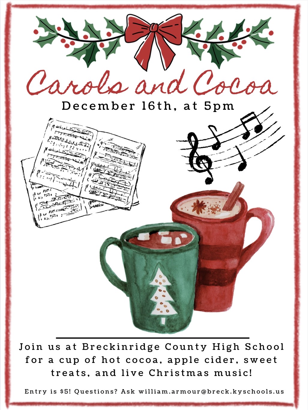 ☕🎤 Carols & Cocoa — Tuesday, December 16th @ 5:00 pm in the BCHS Commons before the Fighting Tiger Basketball game. Enjoy holiday favorites, sweet treats, and performances by BCHS Chamber Singers & friends! 🍫🎵